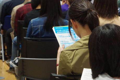 まず、マイナビの担当者から「インターンシップの概要」についてご説明いただき、その後、本学キャリアセンター職員から「学内募集インターンシップ」の受入れ企業・団体や今後のスケジュールについて説明しました。マイナビによれば、2019年卒生のインターンシップ参加率は80%を超え、インターンシップは就業のプレ体験として定着しています。
