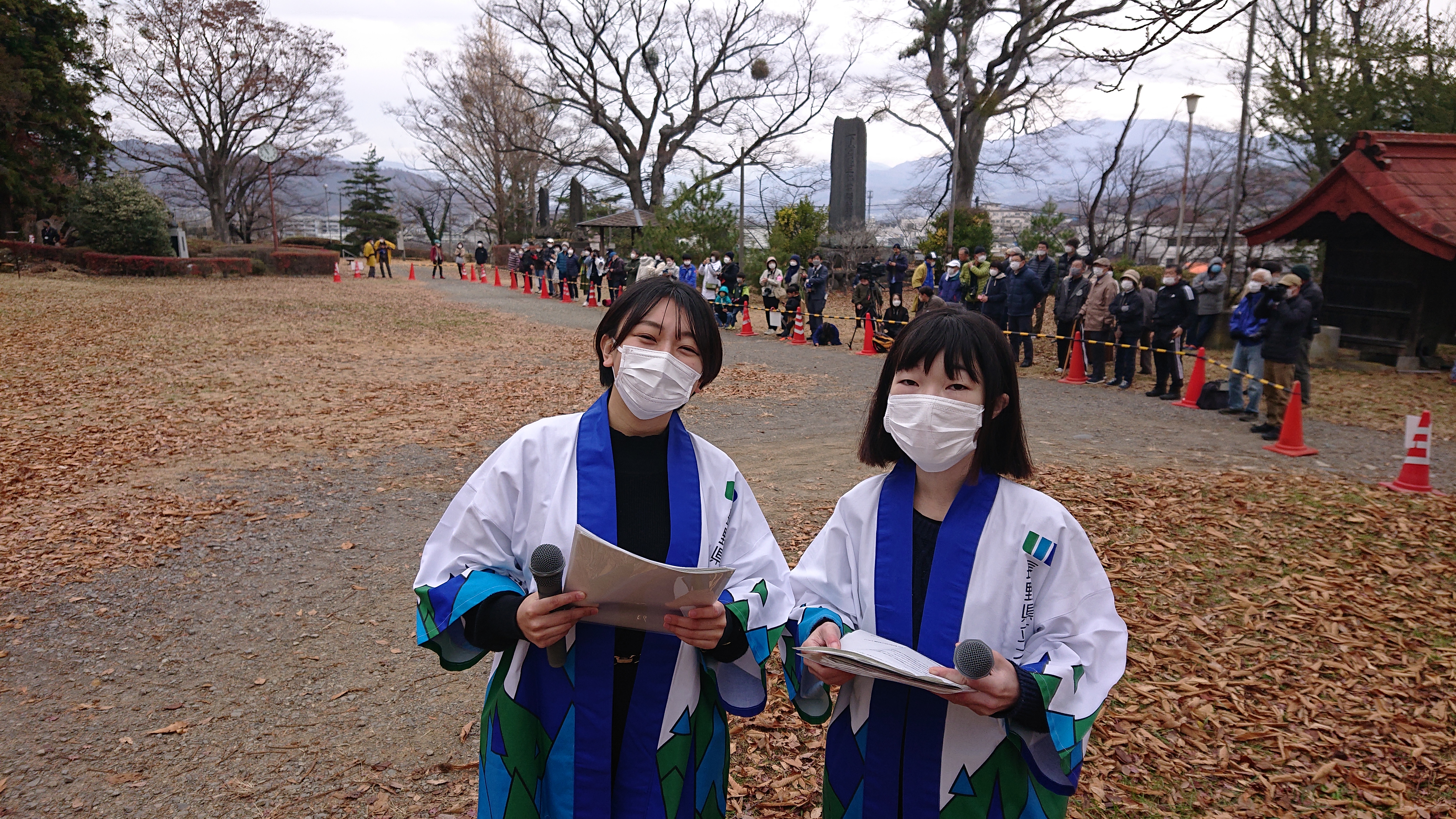 グローバル教養ゼミ(二本松泰子グローバルマネジメント学部教授)では毎年、上田市丸子地域自治センターと協働し「木曽義仲・巴御前を軸とする地域活性化」のプロジェクトに取り組んでおり、丸子地域では令和4年の1年間を「義仲イヤー」と銘打って「信州丸子義仲祭り」のプロジェクトを運営しています。このプロジェクトの一環として、11月20日(日)、安良居神社において諏訪流放鷹術(鷹狩り)実演が行われ、グローバル教養ゼミ(二本松泰子グローバルマネジメント学部教授)の学生が司会を務めました(イベントの様子はこちらをご覧ください:丸子テレビ放送『信州丸子義仲まつり 冬の陣』)