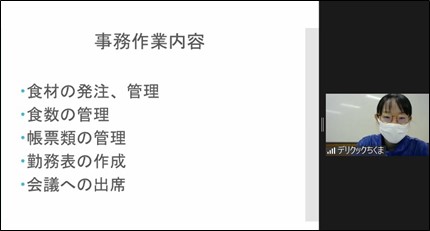 前半は、株式会社デリクックちくま人事課の早川様から会社概要を、管理栄養士の佐藤様から業務内容や就職活動の経験談を伺いました。佐藤様はこれまで特別養護老人ホームと病院での給食づくりや事務作業、本社での献立づくりや開発などを担当されており、様々な施設で働く面白さややりがいについてもお話いただきました。