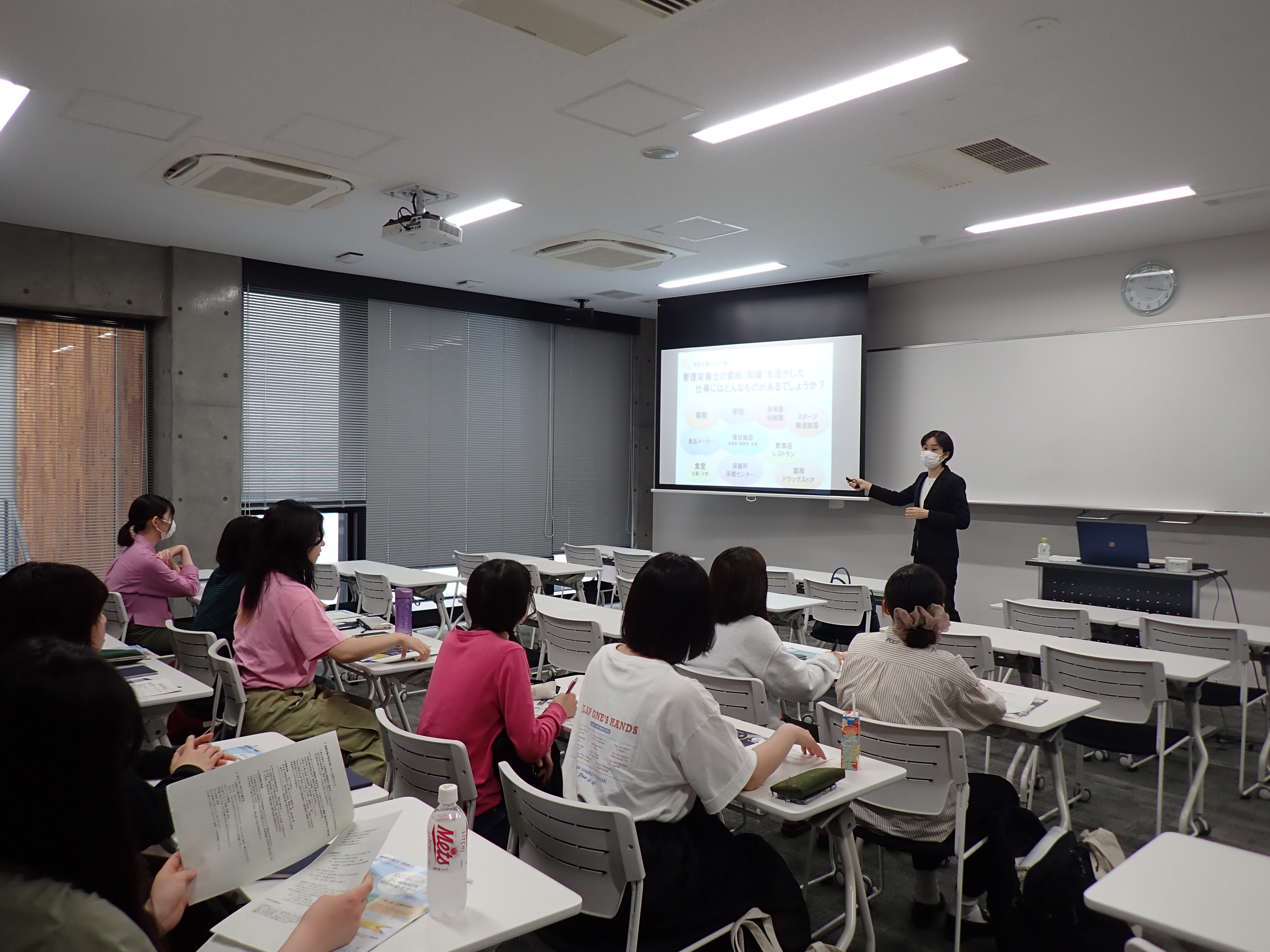 ガイダンスでは、就職活動の流れや活動スタート前にやっておきたいこと、管理栄養士の就職先などについてお話し頂き、これからの活動開始に向け、押さえておきたい就職活動のステップを確認しました。