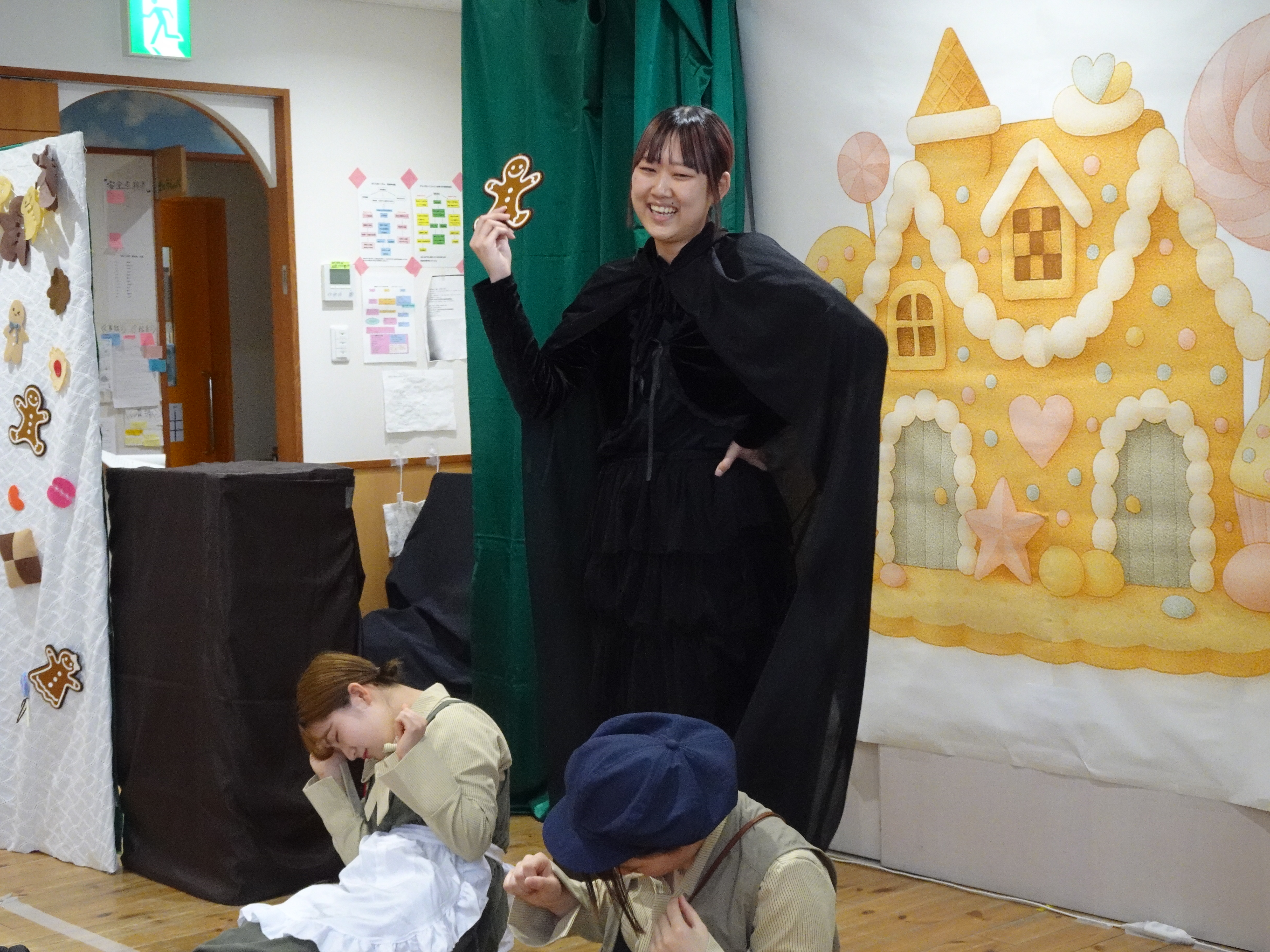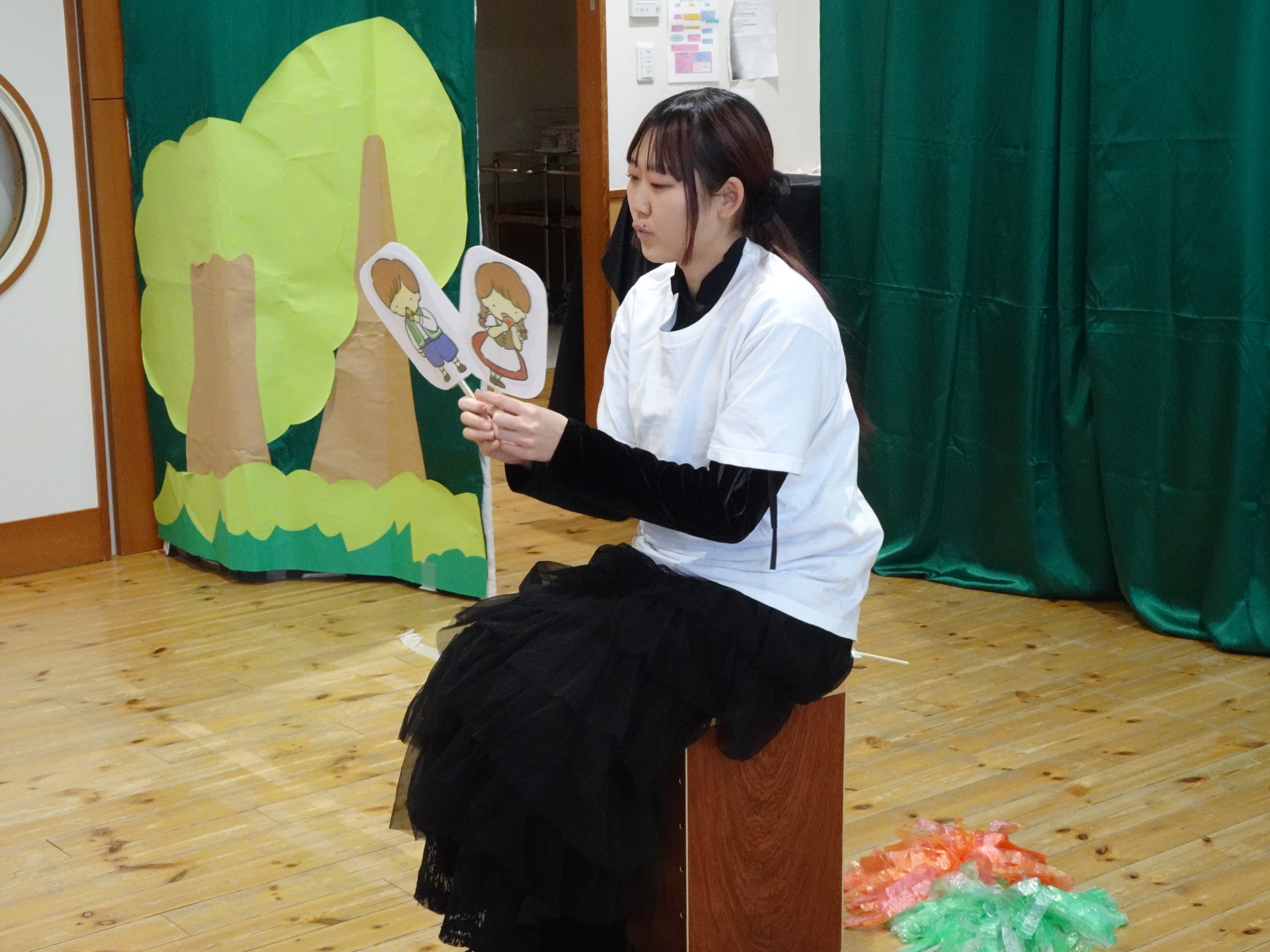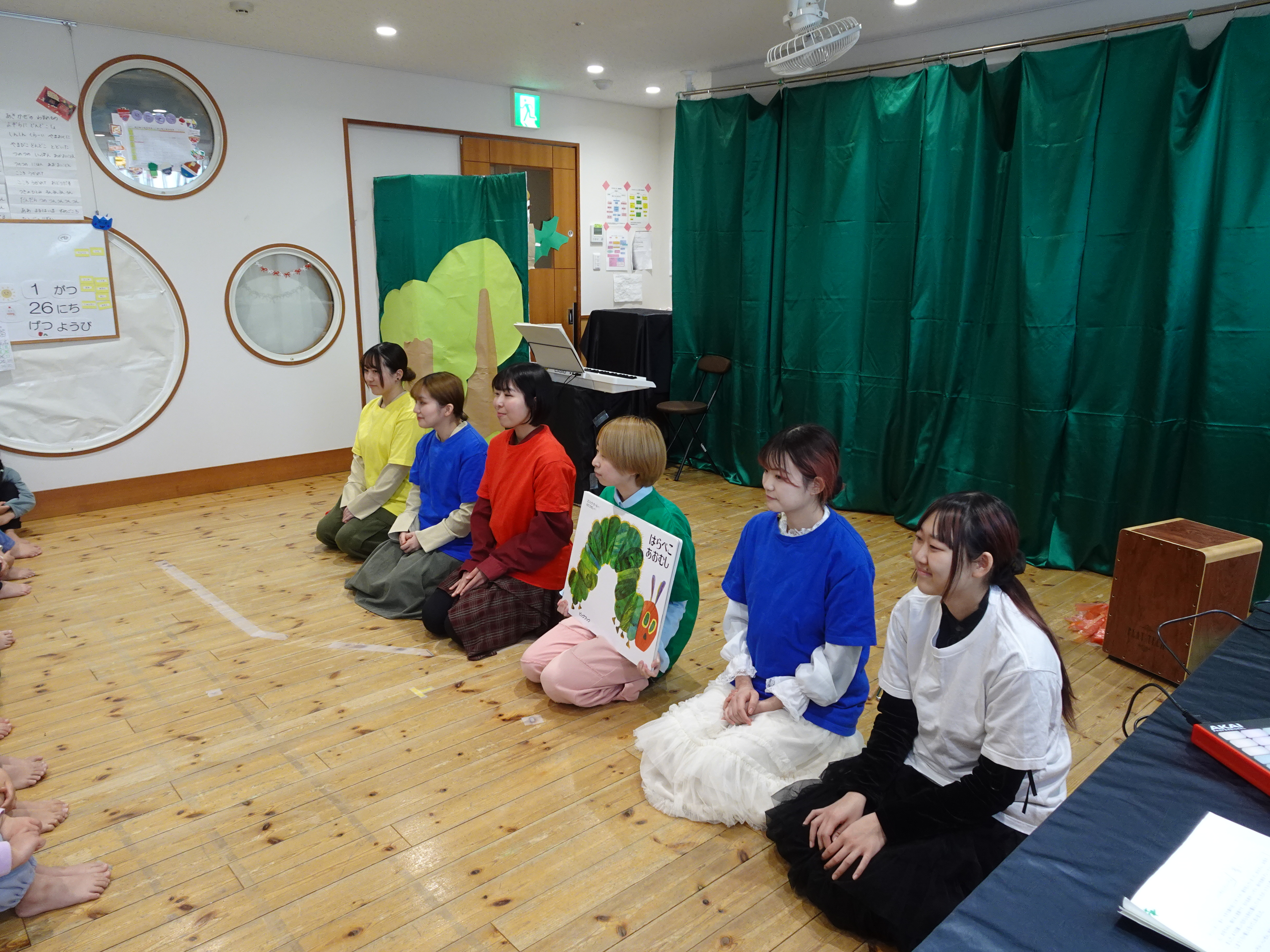 当日は乳児さんも多く鑑賞してくださり、「楽しんでもらえるだろうか」と学生たちは緊張した様子でした。しかし、園児さんたちが真剣に舞台に向き合い、一生懸命見てくれる姿に励まされ、学生たちも最後まで力を尽くして発表することができました。