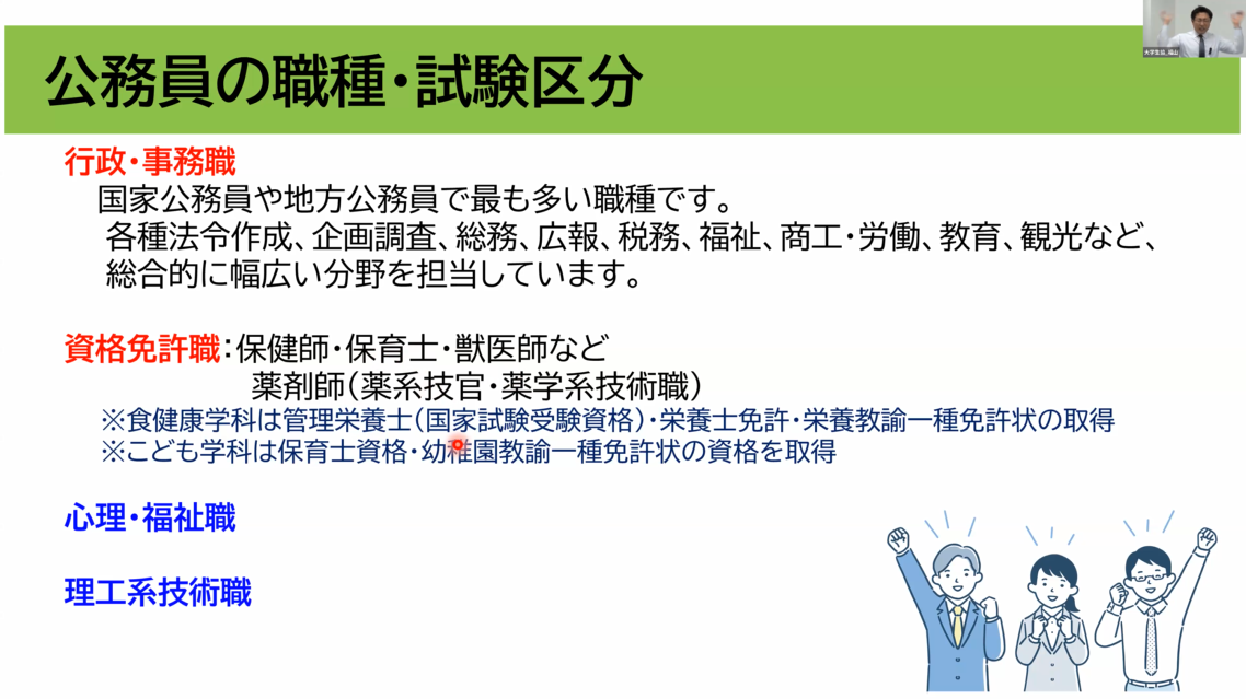 ガイダンスでは、公務員試験の内容や対策に加え、行政職、管理栄養士、保育士など多様な職種の魅力を丁寧に解説。講師からは「知らない仕事は選べない。まずは公務員にどんな職種や業種があるのか広く知ることが大切」とアドバイスが送られました。