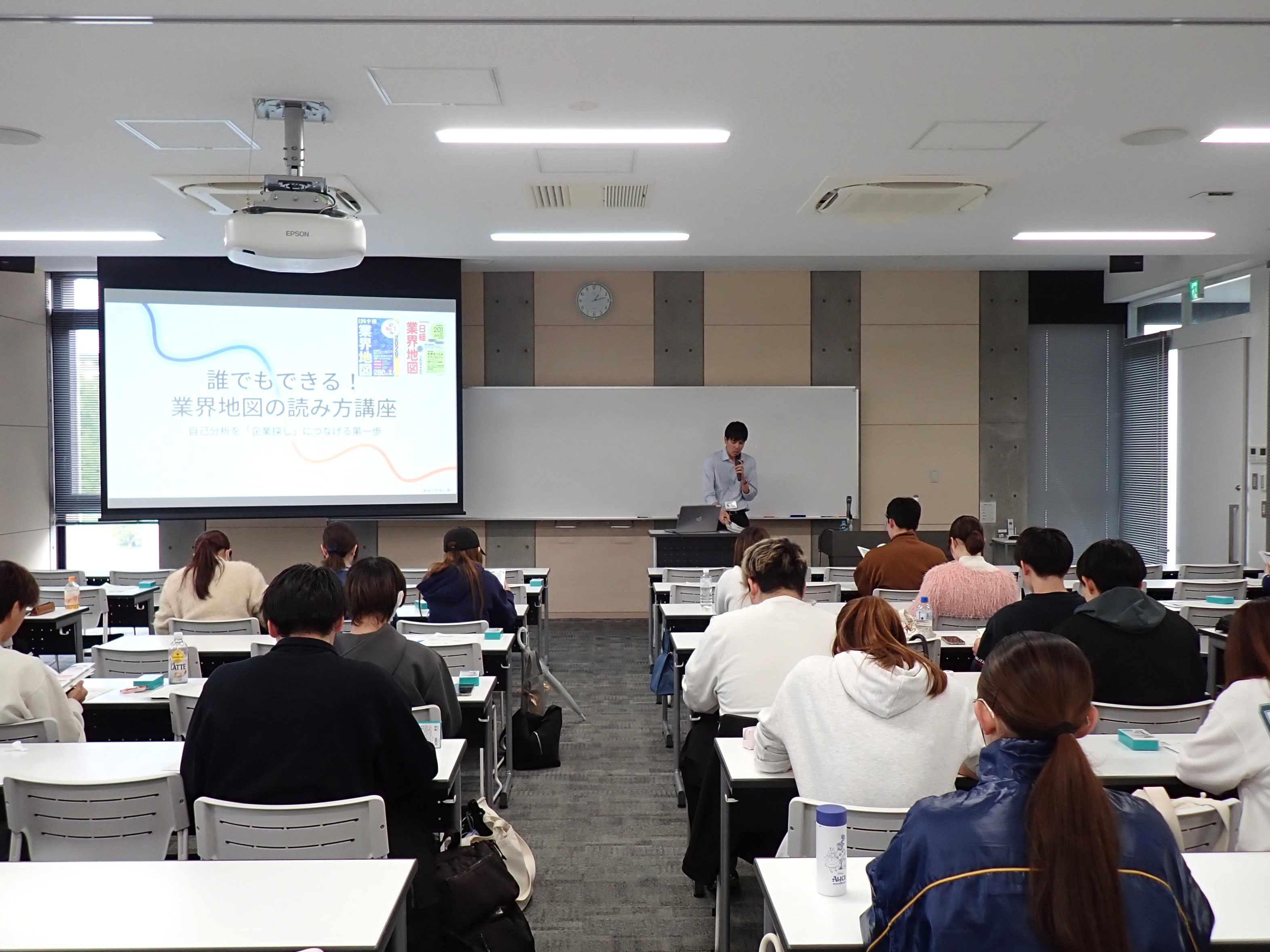 4月23日(木)に、3年生対象の「誰でもできる!初めての業界地図の読み方講座」を開催し、約40名の学生が参加しました。“自分らしい”就職活動のために欠かせない柱の一つである「業界理解」をテーマに実施しました。