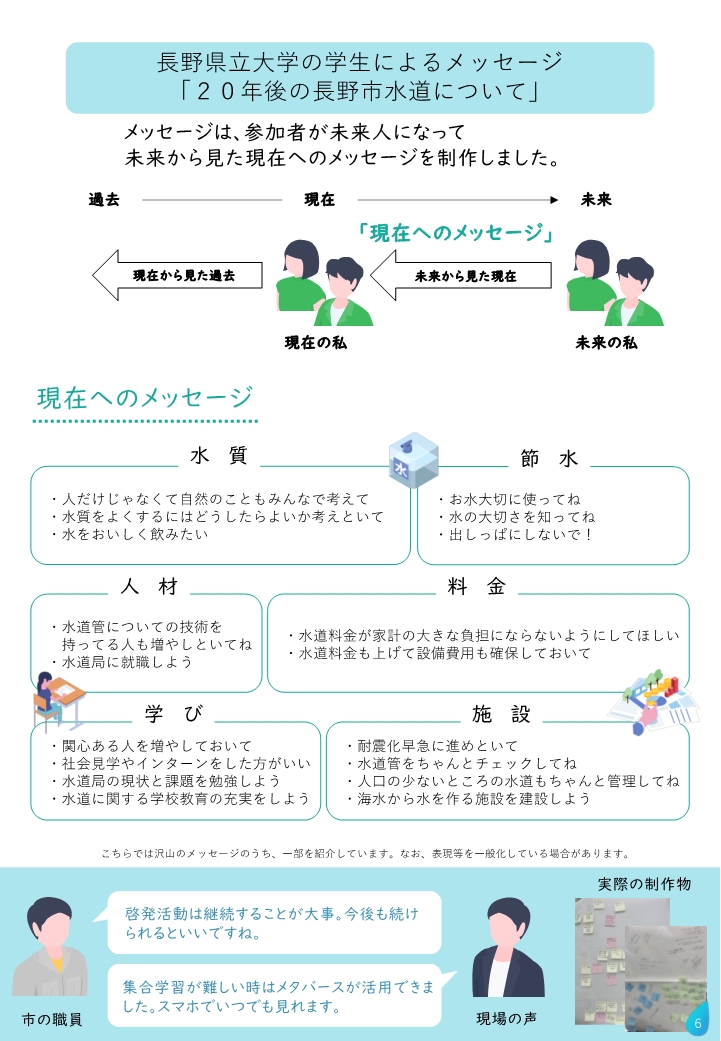 プログラムの一環として長野市内にある上下水道施設の見学や長野市職員からの解説を受けたり、メタバース空間を使った国土交通省、横浜ウォーター株式会社、長野市のレクチャーを受けた上で未来人になりきって発想する「フューチャー・デザイン」を用いたことにより、学生にも生きた学びになりました。