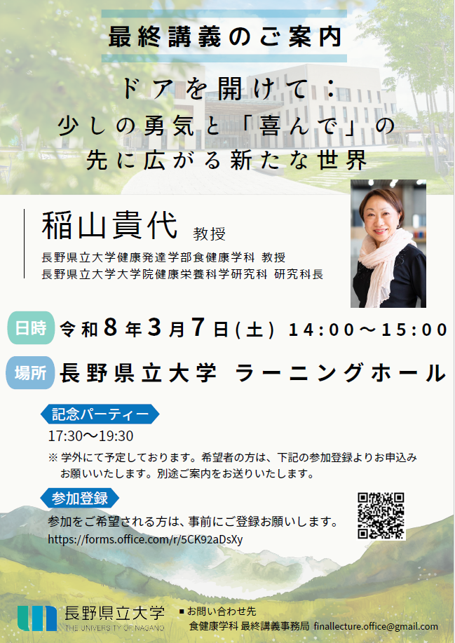 稲山教授は、開学以来、長野県立大学健康発達学部食健康学科教授、ならびに大学院健康栄養科学研究科研究科長として、本学の教育・研究の発展に多大なるご尽力をいただきました。