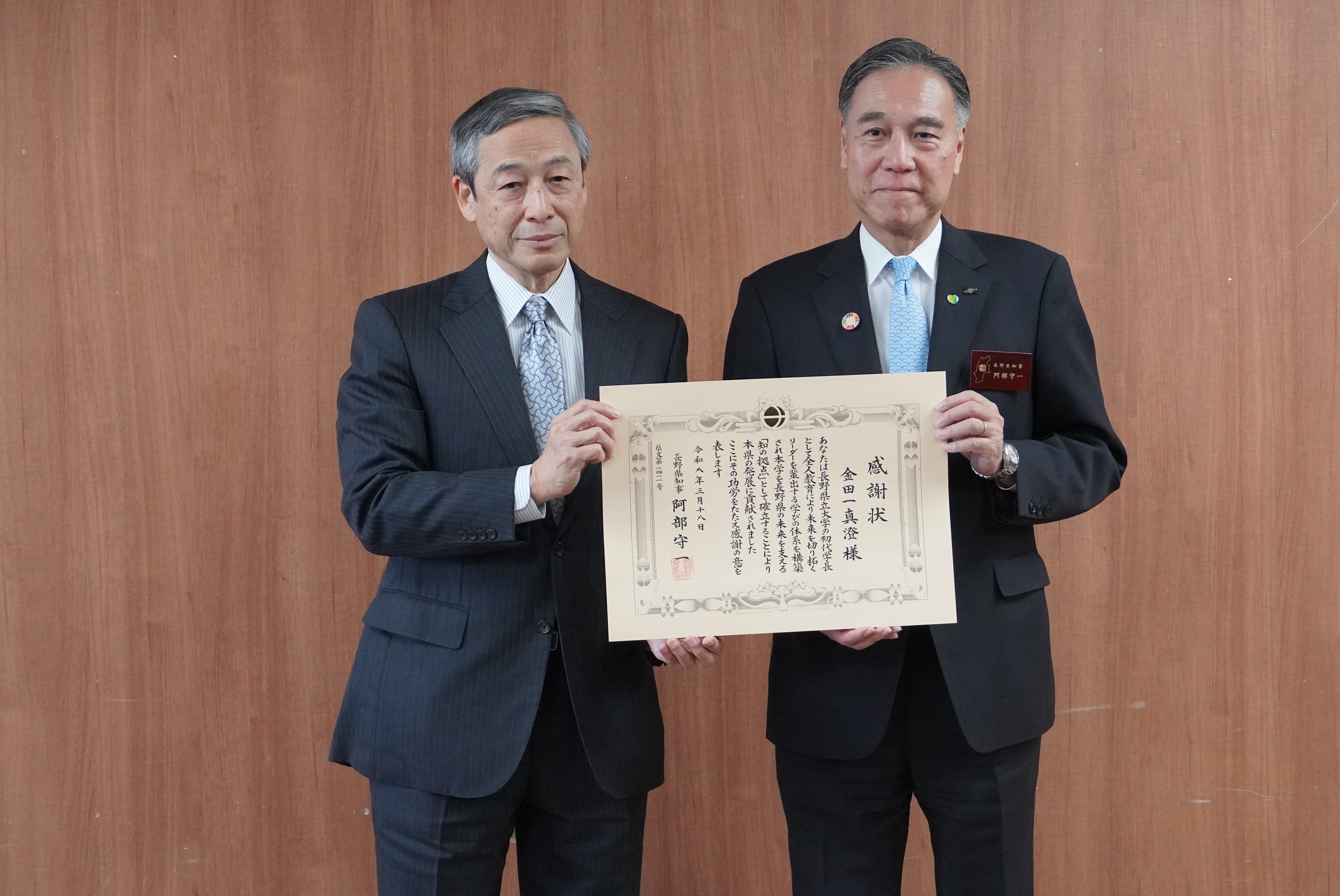 長野県から18日、任期満了で今月末に退任する金田一真澄学長に感謝状が贈られました。金田一学長は、2018年度の県立大四年制化開学時の初代学長として2期8年間務め、設立委員会副委員長も兼任しました。開学後は自身も講義を担当し、入学式では新入生一人ひとりと握手を交わすことが恒例となっていました。