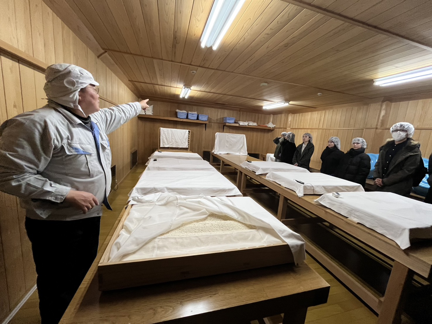 31日には、九州地域の酒類産業について理解を深めるため、キリンビール九州工場および株式会社篠崎を訪問しました。製造現場の見学を通じて、座学だけでは得られない実践的な知識や、ものづくりの現場の雰囲気を学ぶ貴重な機会となりました。特に、株式会社篠崎では清酒製造現場や麹室の見学に加え、ウイスキーの製造現場についても説明を受け、日本酒やビールとは異なる製造方法への理解を深めていました。本訪問は、公益財団法人発酵研究所・研究室助成を活用して実施しました。