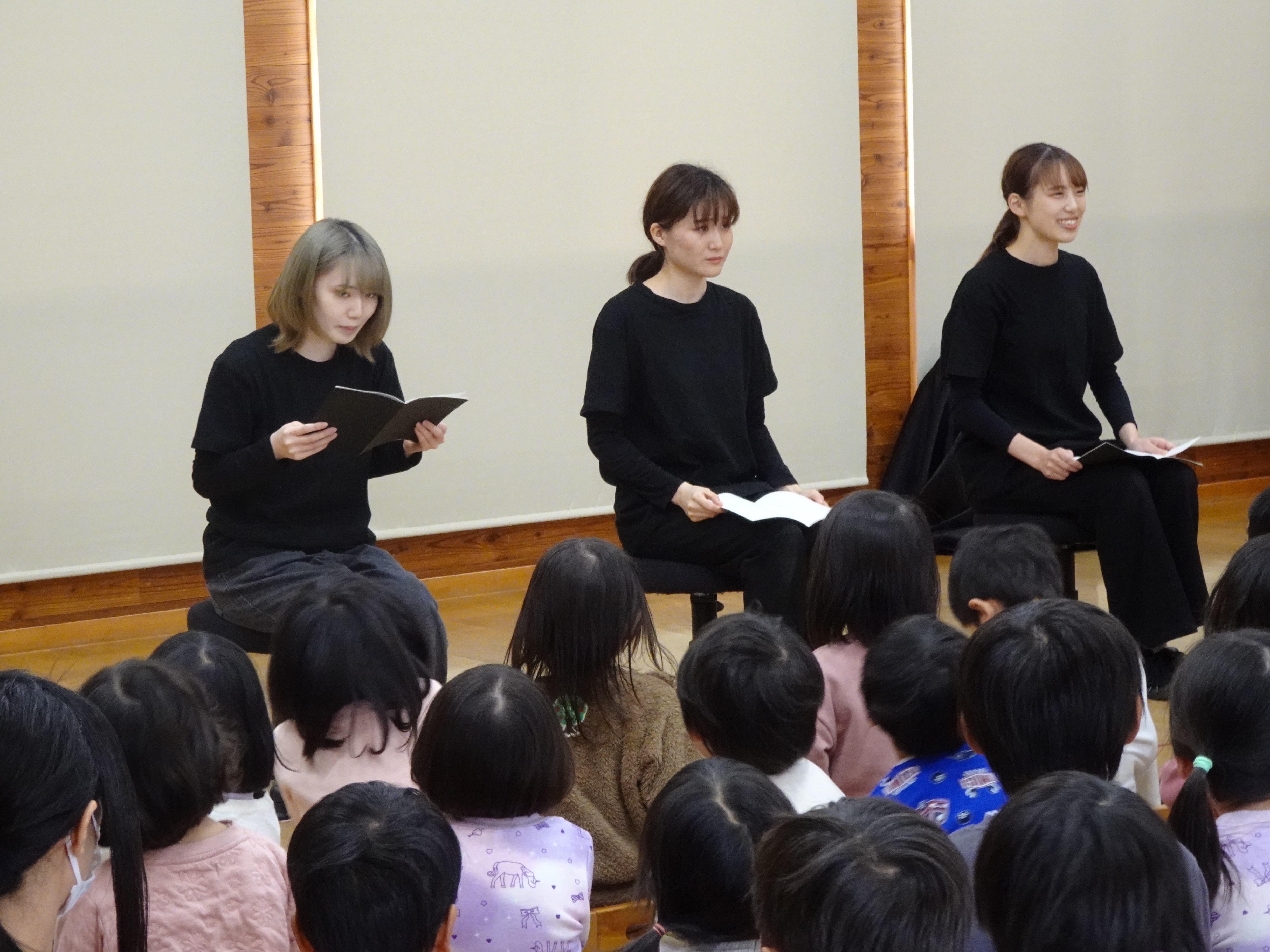 2023年11月20日、須坂市内の保育園を訪れ、園児さんに対して2つの朗読劇「ビロードのうさぎ<M・ビアンコ原作/酒井駒子絵・訳/河西更紗構成>」「おうさまになったねずみ<風木一人原作/花輪充構成>」、歌と演奏「はらぺこあおむし<エリックカール/新沢としひこ作曲/中村暢之編曲/湯川徹ピアノ用編曲/麓洋介合奏指導>」、参加劇「ピノッキオの冒険<C・コッローディ原作/大岡玲訳/倉石倭子構成>」を発表しました。昨年に引き続き、園児さんも声や身体の動きで一緒に参加してくださる参加劇に挑戦しました。園児さんから、学生がびっくりするくらいの積極的な参加があり、学生もタジタジの様子でした。